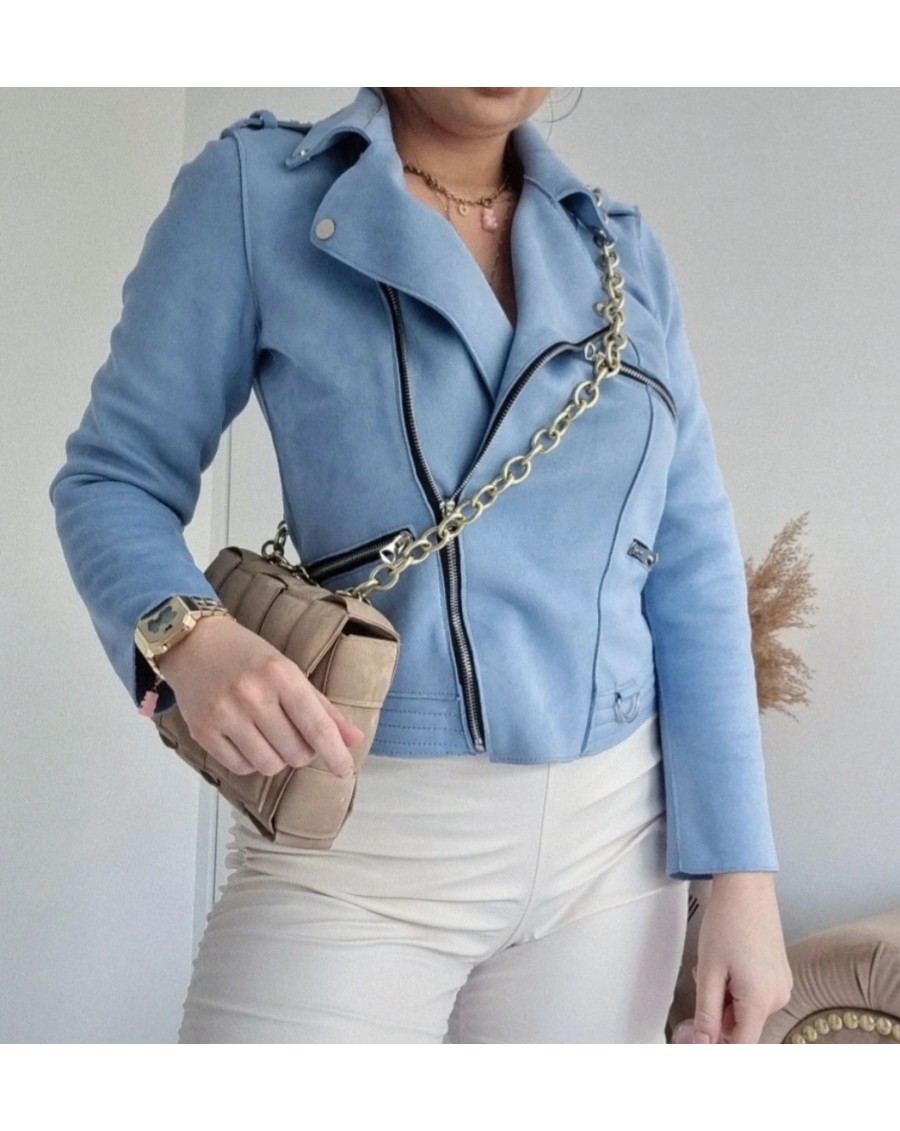 Niebieska damska kurtka ramoneska. Materiał przypominający zamsz. Jest to idealny wybór na wiosnę. Kurtka ma charakterystyczny styl ramoneski, z krótkim i dopasowanym krojem. Jej niebieski kolor nadaje jej świeżości i energii, co doskonale pasuje do sezonu wiosennego. Jej klasyczny styl i wygodny fason sprawiają, że jest to uniwersalny element garderoby, który można zestawić z różnymi stylami dodatkami.
