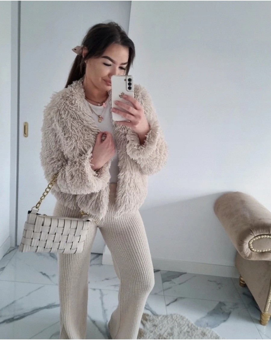 Beżowa kurtka futrzak z kieszeniami.Kurtka jest zapinana na zatrzaski. Można ją nosić na co dzień, do pracy lub na bardziej formalne okazje. Bez względu na to, jak ją zestawisz, ta beżowa kurtka futrzak z pewnością doda Ci elegancji i stylu, podkreślając Twój indywidualny styl. Beżowy jest  kolorem neutralnym i pasuje do wielu innych kolorów, co sprawia, że jest to dobry wybów dla wielu różnych stylizacji.