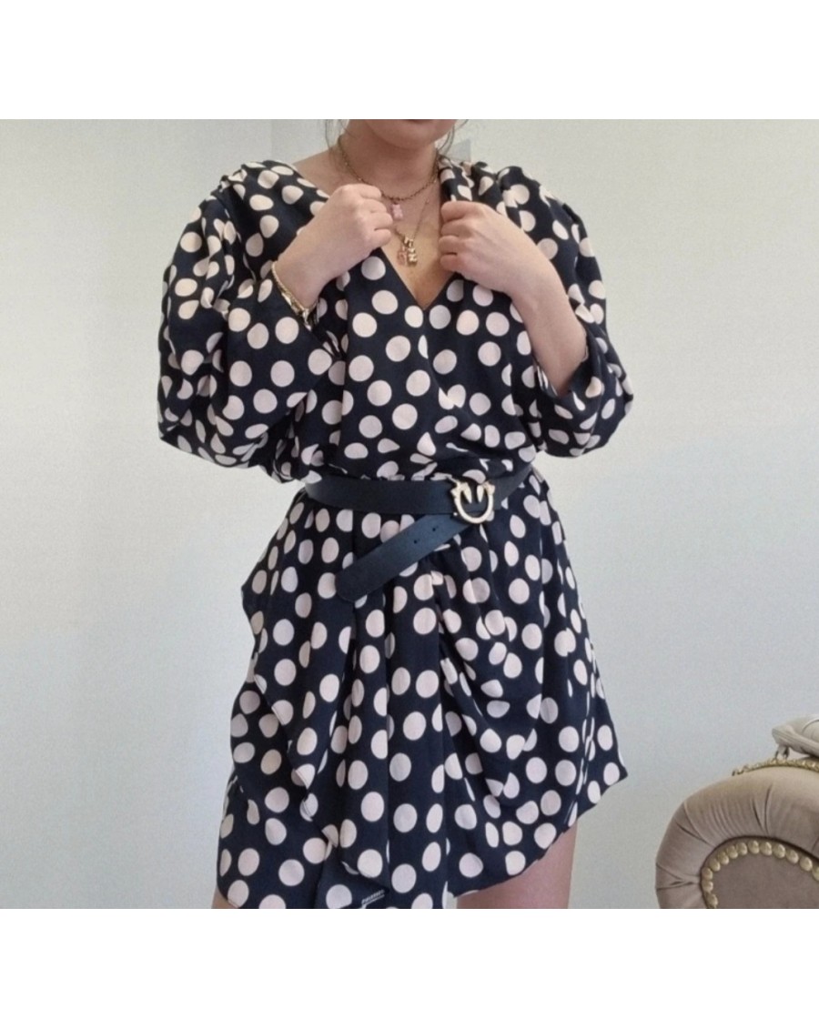 Sukienka koloru czarnego w beżowe groszki. Sukienka ma dekolt w kształcie litery V, jeden bok sukienki zakończony falbanką. Takie połączenie klasycznej czerni z delikatnym wzorem w beżowe kropki sprawia, że sukienka jest elegancka i jednocześnie subtelna, a falbana dodaje jej lekkości i dziewczęcego uroku.