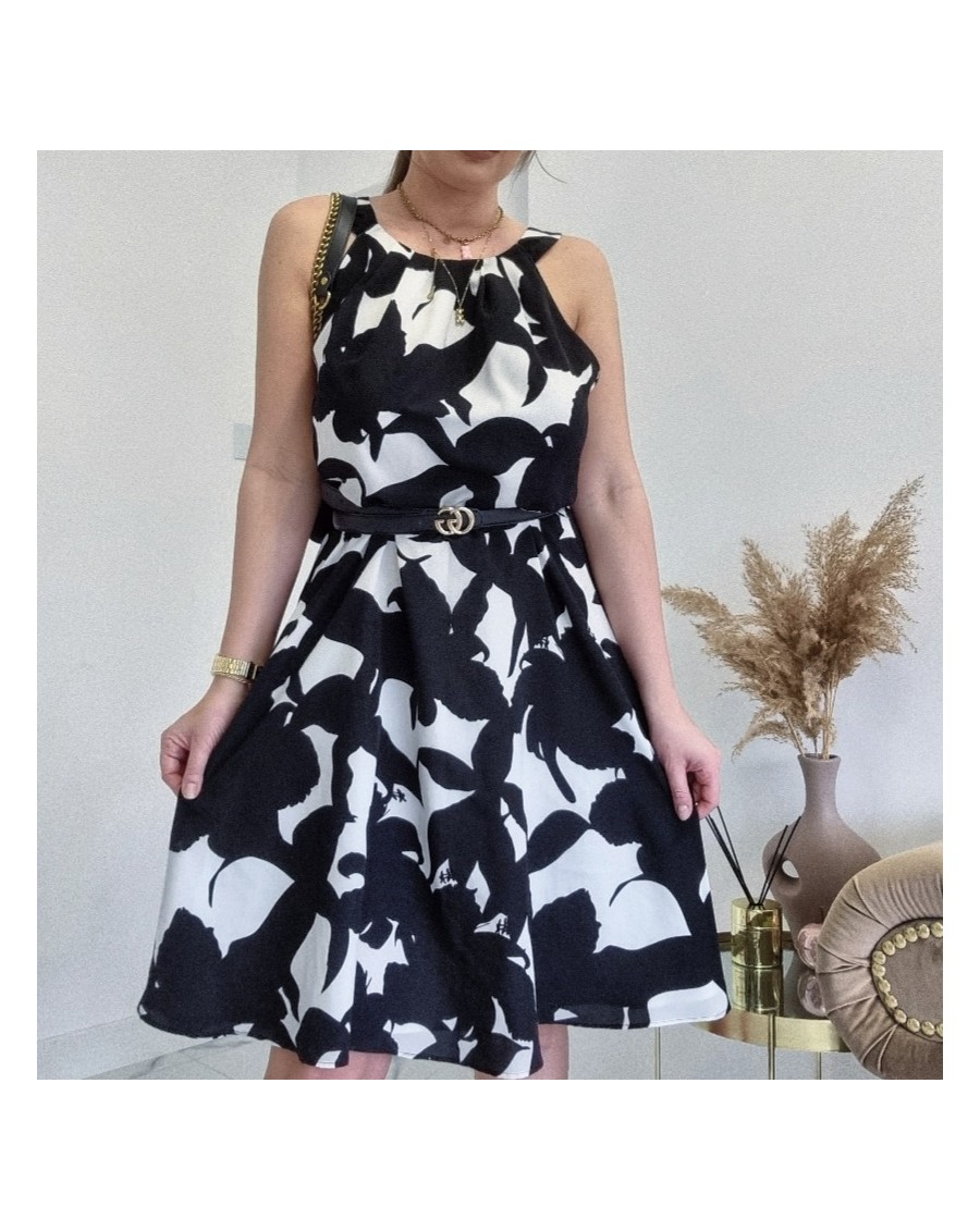 Sukienka posiada klasyczny, elegancki wygląd w czarno-białe wzory. Sukienka jest idealna na specjalne okazje lub na spotkania biznesowe, ponieważ połączenie czerni i bieli jest ponadczasowe i eleganckie. Sukienka jest zapinana z boku na suwak. Sukienka jest wykonana z luźnego i przewiewnego materiału, co oznacza, że jest wygodna w użytkowaniu. Rozkloszowany krój sukienki zapewnia swobodę ruchów i ukrywa mankamenty sylwetki.