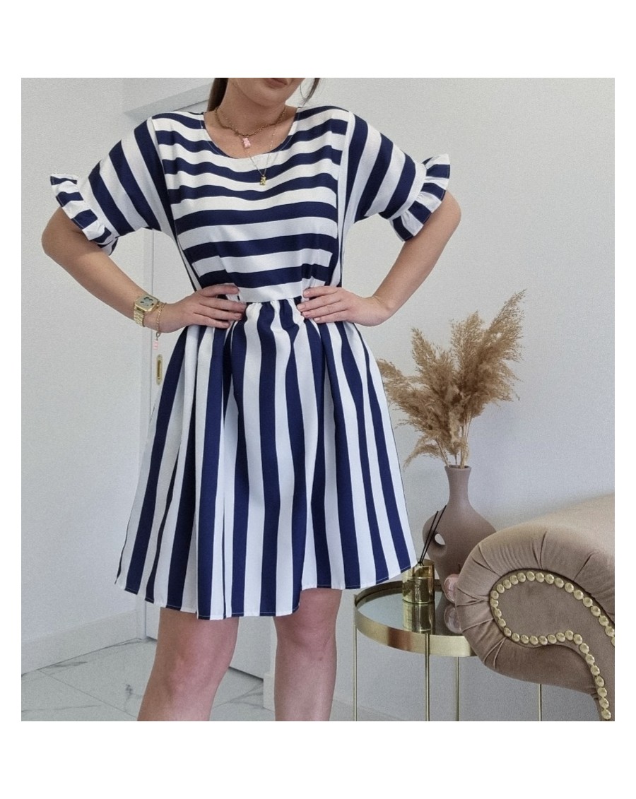 Sukienka rozkloszowana, ma luźny, swobodny krój, który zwiększa jej objętośc i zapewnia wygodę podczas noszenia. Rękawy sukienki są ozdobione falbanką, co nadaje im kobiecej i delikatnej estetyki. Sukienka posiada kieszenia po bokach. Biały oraz granatowy kolor to klasyczne kolory, które razem tworzą bardzo stylową kombinację. Sukienka sprawdzi się na każdą okazję.