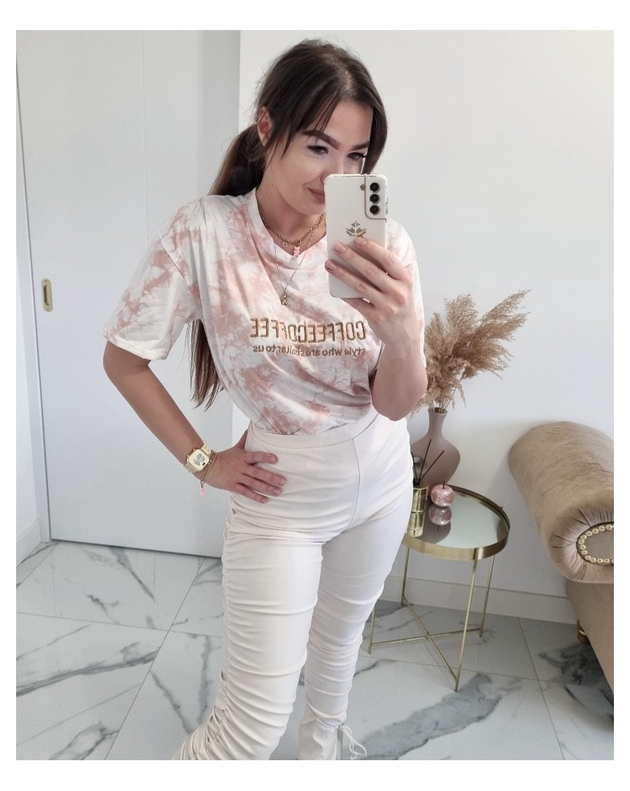 Bluzka jest wykonana z miękkiego, elastycznego materiału, co sprawia, że jest wygodna w noszeniu. Bluzka z napisem. Posiada marmurkowy wzór, biało-różowa kolorystyka nadaje jej modny i atrakcyjny wygląd. Można ją zestawić z jeansami, legginsami oraz spódnicą. Jest to modny i wygodny wybór elementu garderoby.