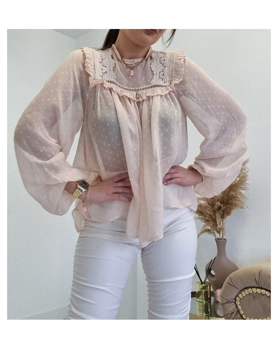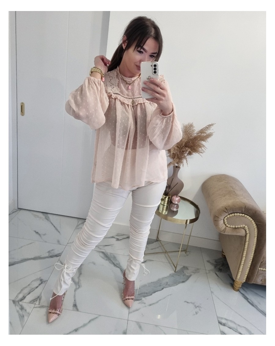 Koszula morelowa mgiełka to luźna, lekka bluzka o delikatnym, pastelowym odcieniu. Jej dekolt zdobiony jest koronkami oraz falbanami, które nadają jej romantyczny wygląd. Rękawy są długie i luźne, a ich końce zakończone są gumką, co dodaje im efektu bufiastego stylu. Kolor morelowy jest idealnym wyborem na wiosnę.Dodatkowo, delikatny materiał mgiełki i zwiewny krój koszuli będą wyglądać bardzo stylowo i modnie. Można ją łączyć z jeansami, spódnicami, legginsami, w zależności od okazji.