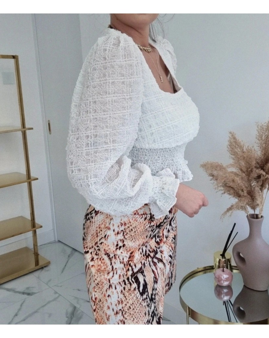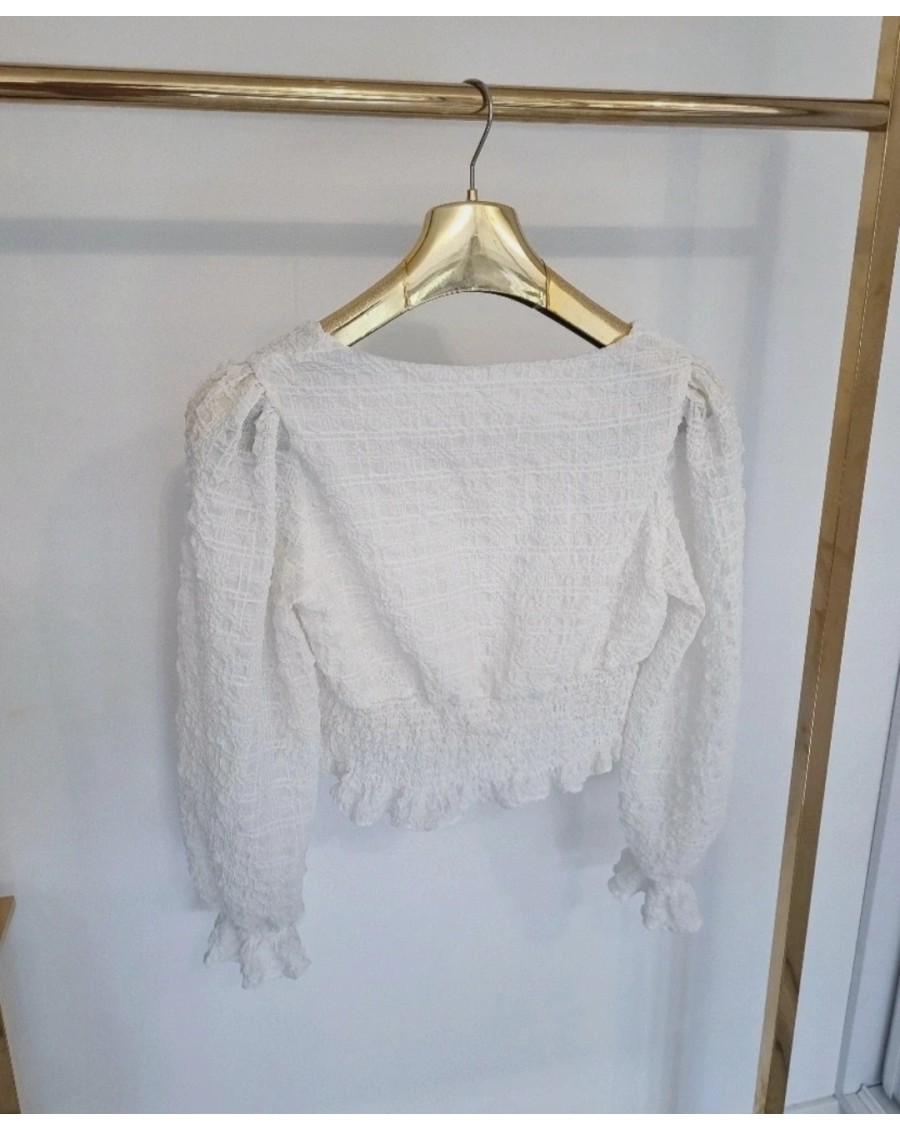 Elegancka biała bluzka to wyjątkowy element garderoby, który zapewni Ci stylowy i modny wygląd. Bluzka została wykonana z delikatnego materiału, który nadaje jej subtelności i finezji. Rękawy zakończone falbanką. Dół bluzki również został ściągnięty za pomocą gumki tworząc efektowną falbankę na dole. Ta falbana dodaje bluzce uroku i kobiecego wdzięku, jednocześnie nadając jej lekko wyrazistego kształtu.