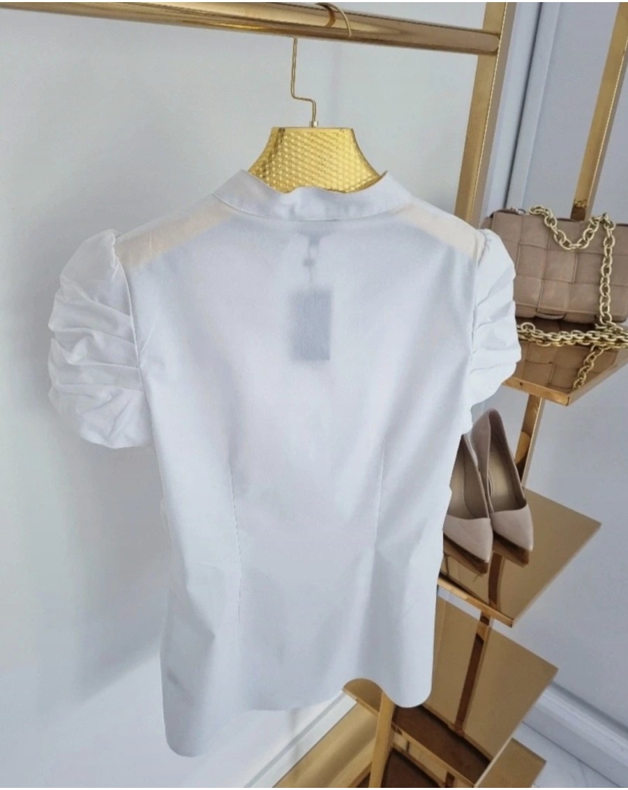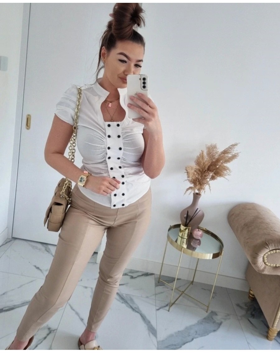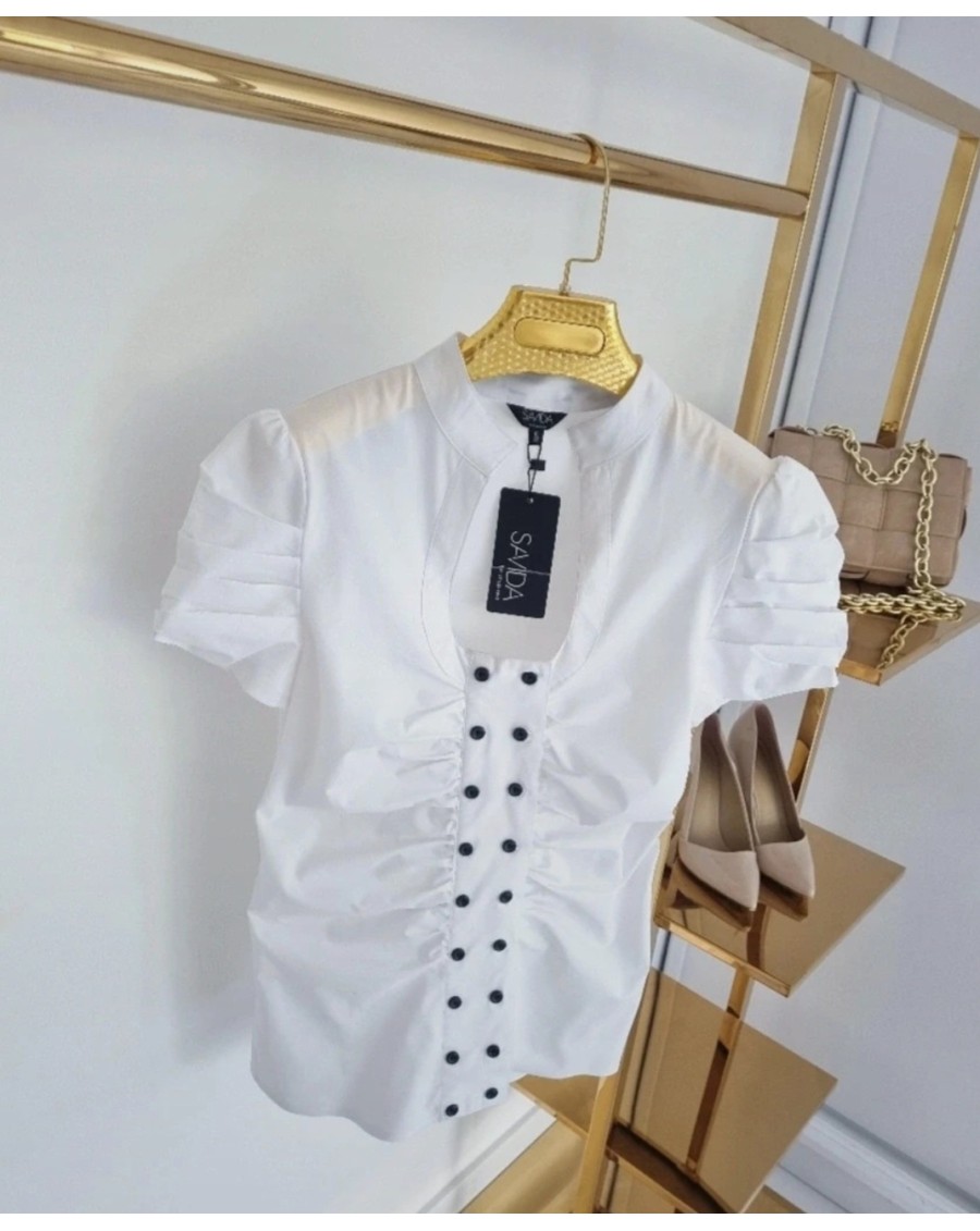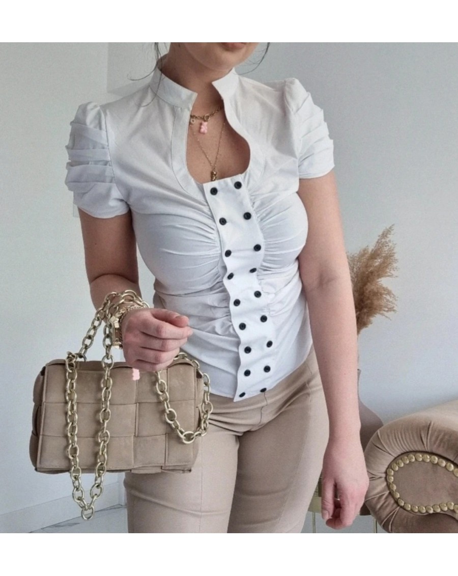 Biała koszula z krótkim rękawem. Jej głównym elementem jest marszczenie na środku, które dodaje jej unikalnego wyglądu. Cała koszula, dzięki swojemu pięknemu kolorowi i dodatkom w postaci marszczenia i czarnych guziczków, wygląda nie tylko elegancko, ale także stylowo i nowocześnie. Jest to uniwersalny element garderoby.