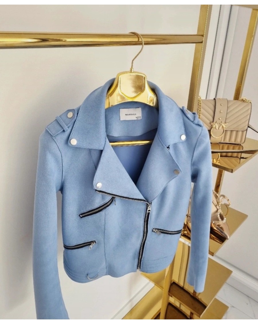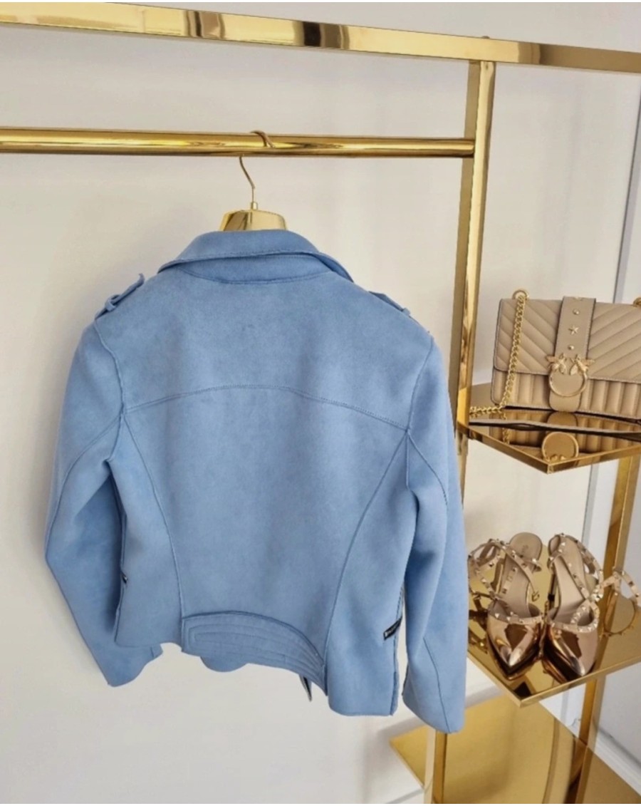 Niebieska damska kurtka ramoneska. Materiał przypominający zamsz. Jest to idealny wybór na wiosnę. Kurtka ma charakterystyczny styl ramoneski, z krótkim i dopasowanym krojem. Jej niebieski kolor nadaje jej świeżości i energii, co doskonale pasuje do sezonu wiosennego. Jej klasyczny styl i wygodny fason sprawiają, że jest to uniwersalny element garderoby, który można zestawić z różnymi stylami dodatkami.