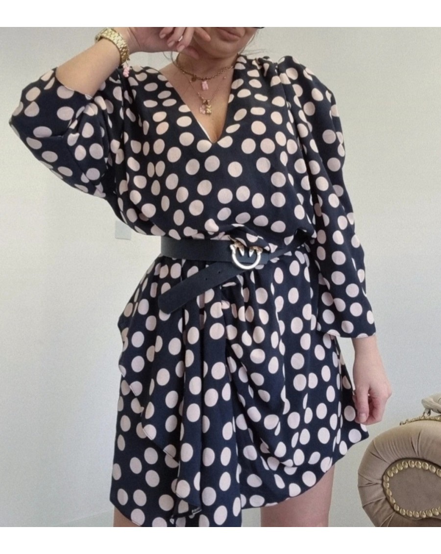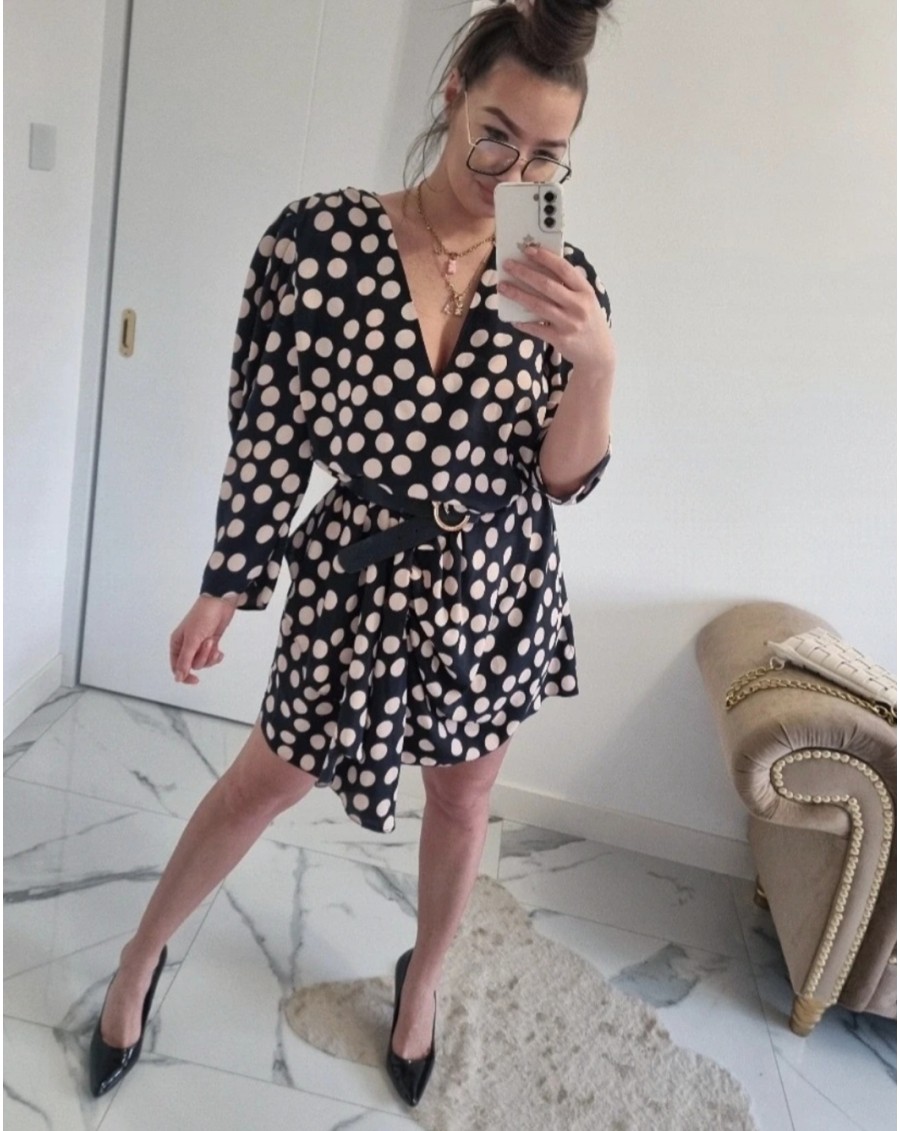 Sukienka koloru czarnego w beżowe groszki. Sukienka ma dekolt w kształcie litery V, jeden bok sukienki zakończony falbanką. Takie połączenie klasycznej czerni z delikatnym wzorem w beżowe kropki sprawia, że sukienka jest elegancka i jednocześnie subtelna, a falbana dodaje jej lekkości i dziewczęcego uroku.