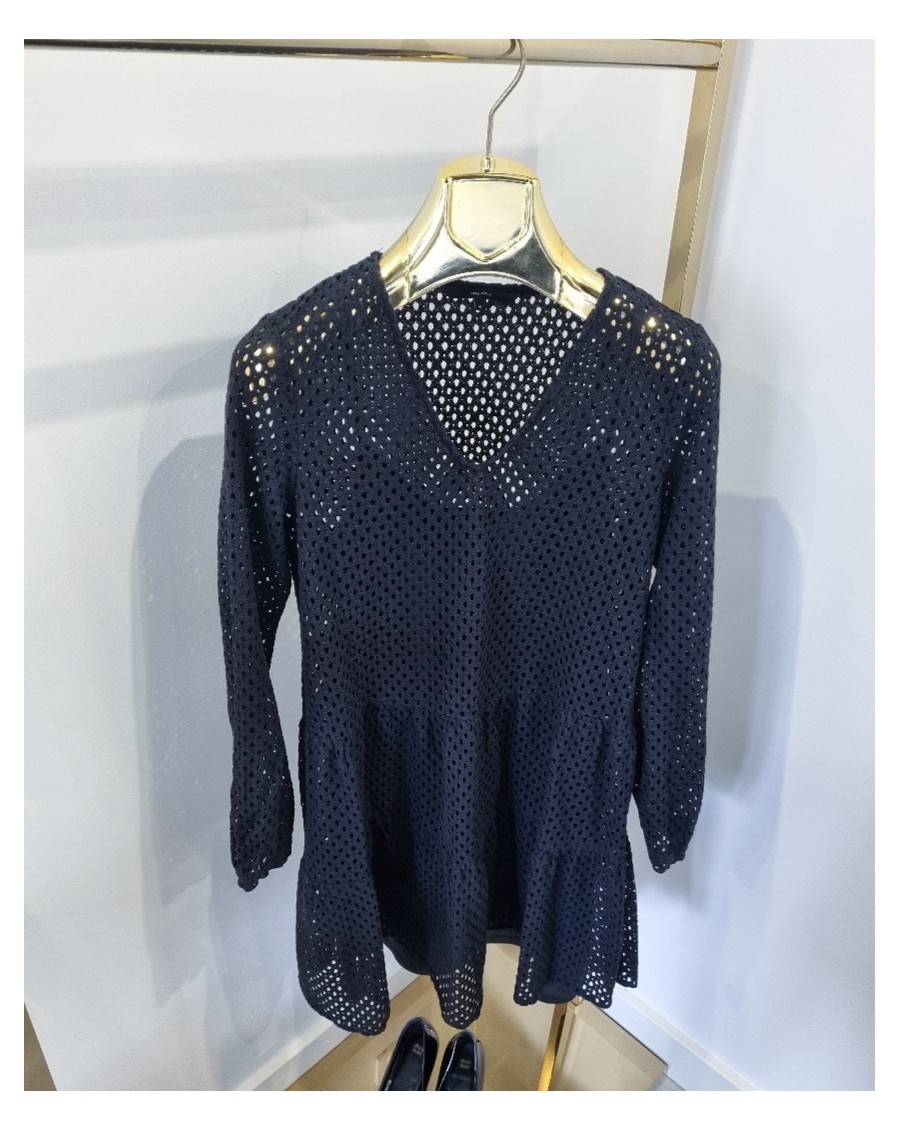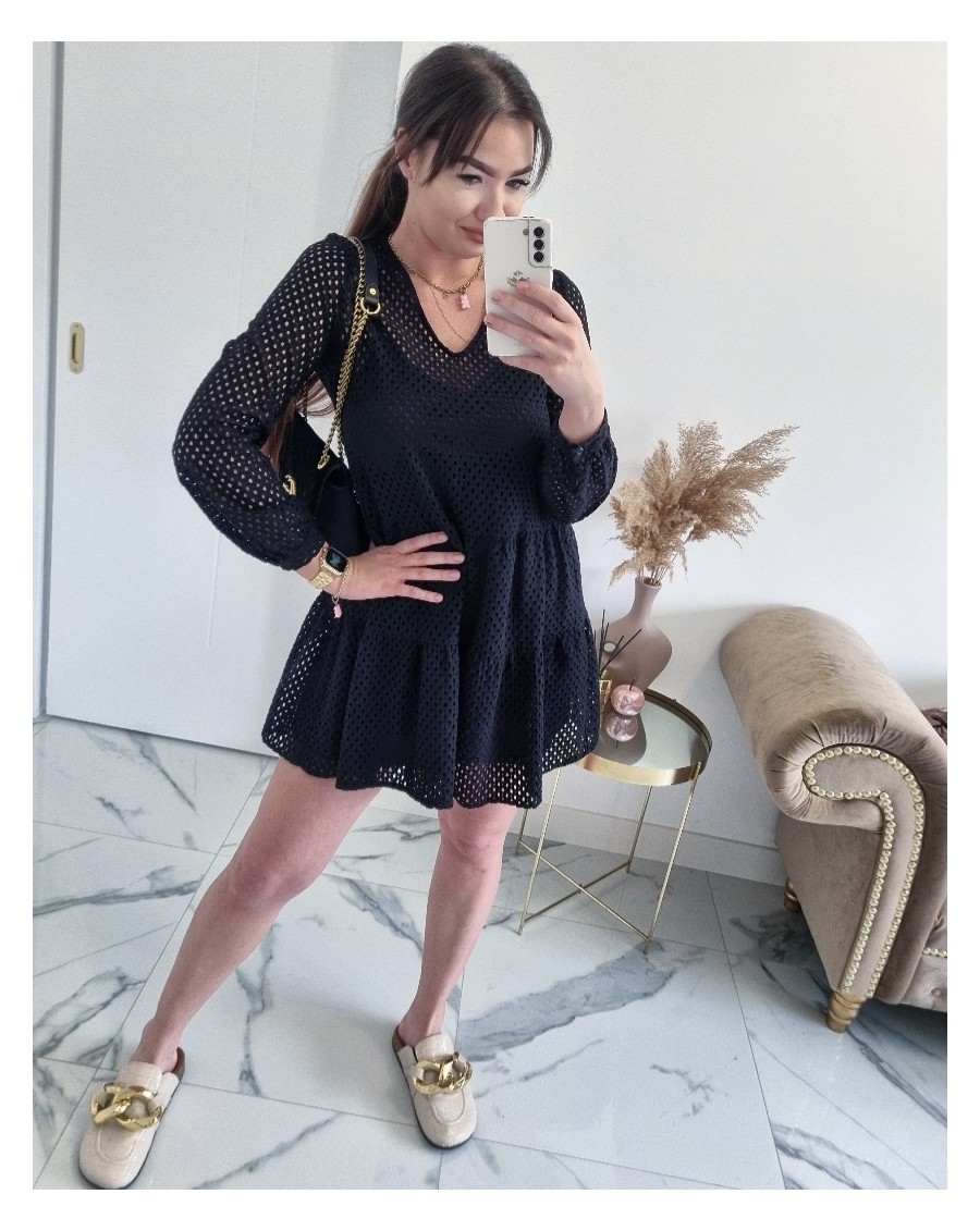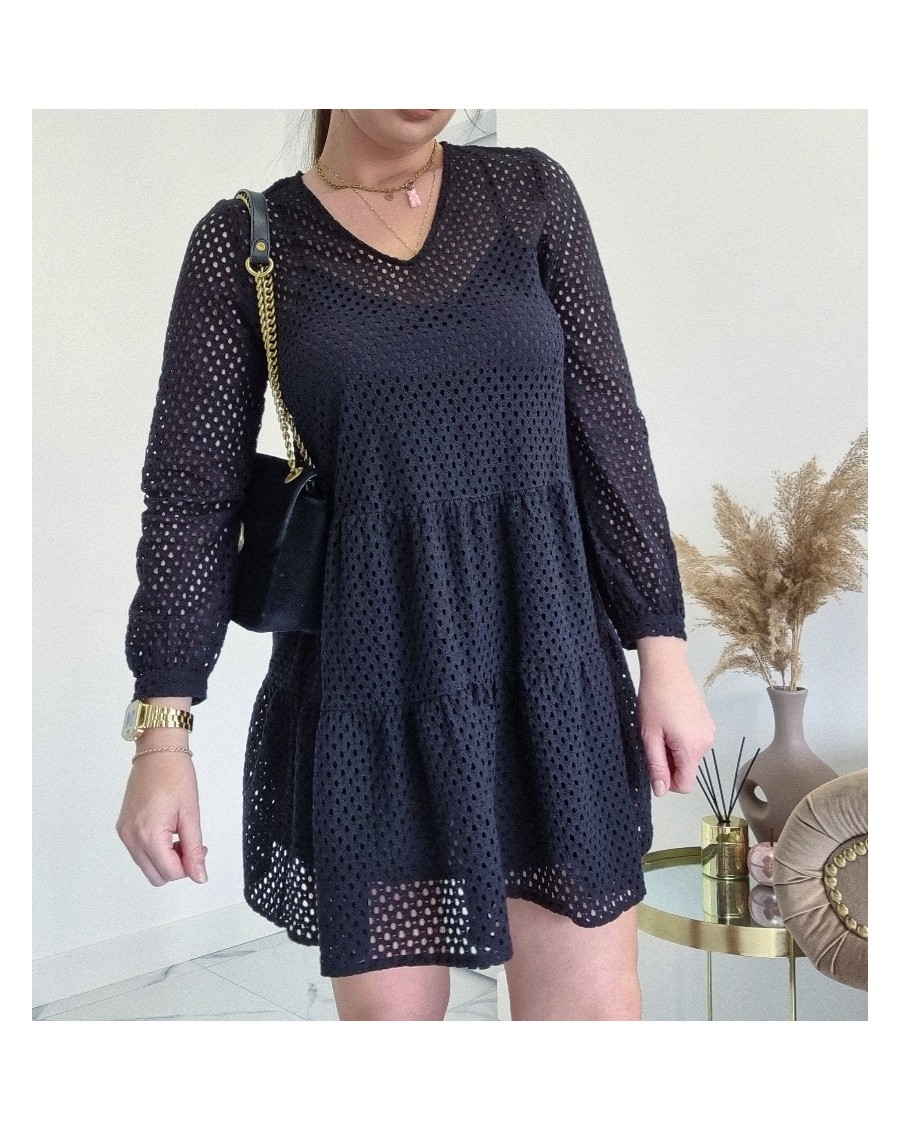 Sukienka rozkloszowana z długim rękawem po całośći, to stylowa propozycja dla kobiet, które lubią elagncki wygląd z nutą romantyzmu. Ta sukienka ma zwiewną, lekko rozkloszowaną spódnicę. Sukienka w całym materiale posiada dziurki, które dodają jej subtelnośći i charakteru. Pod spodem sukienki znajduję się halka.