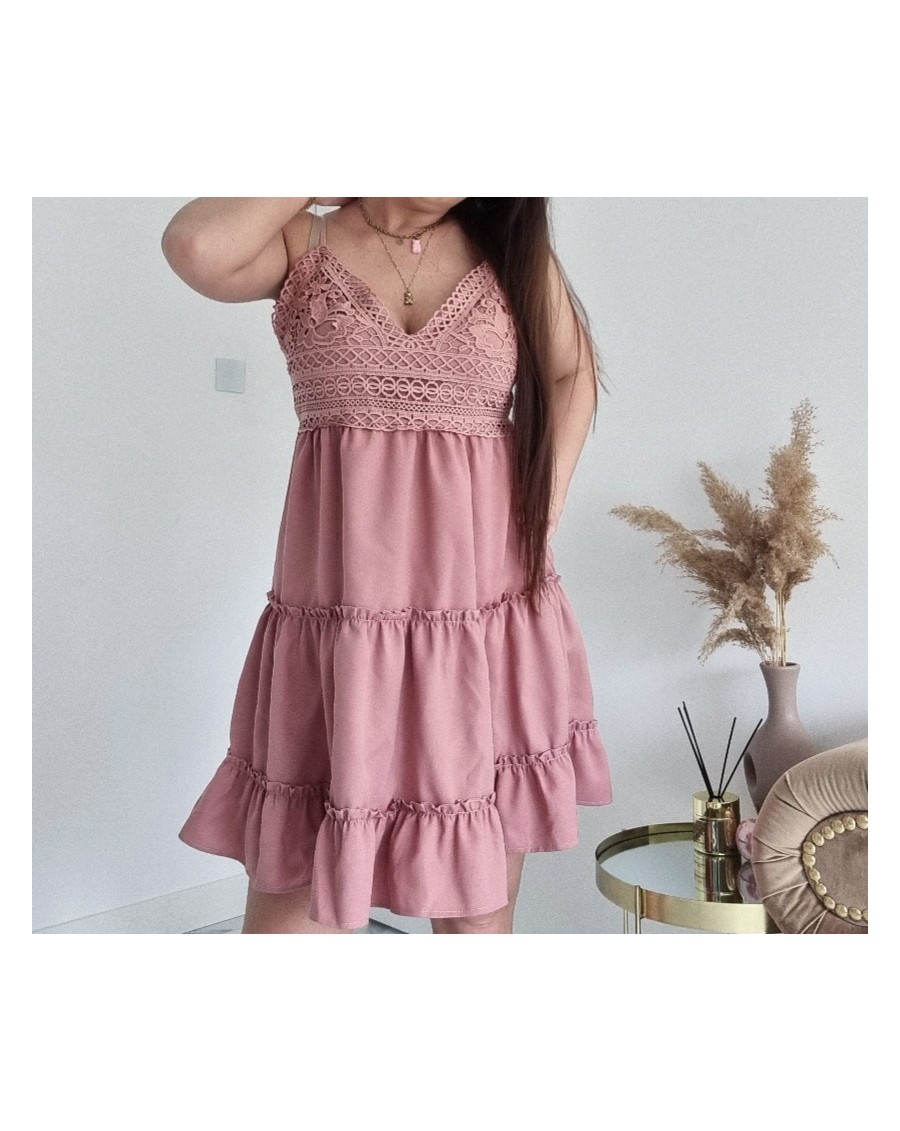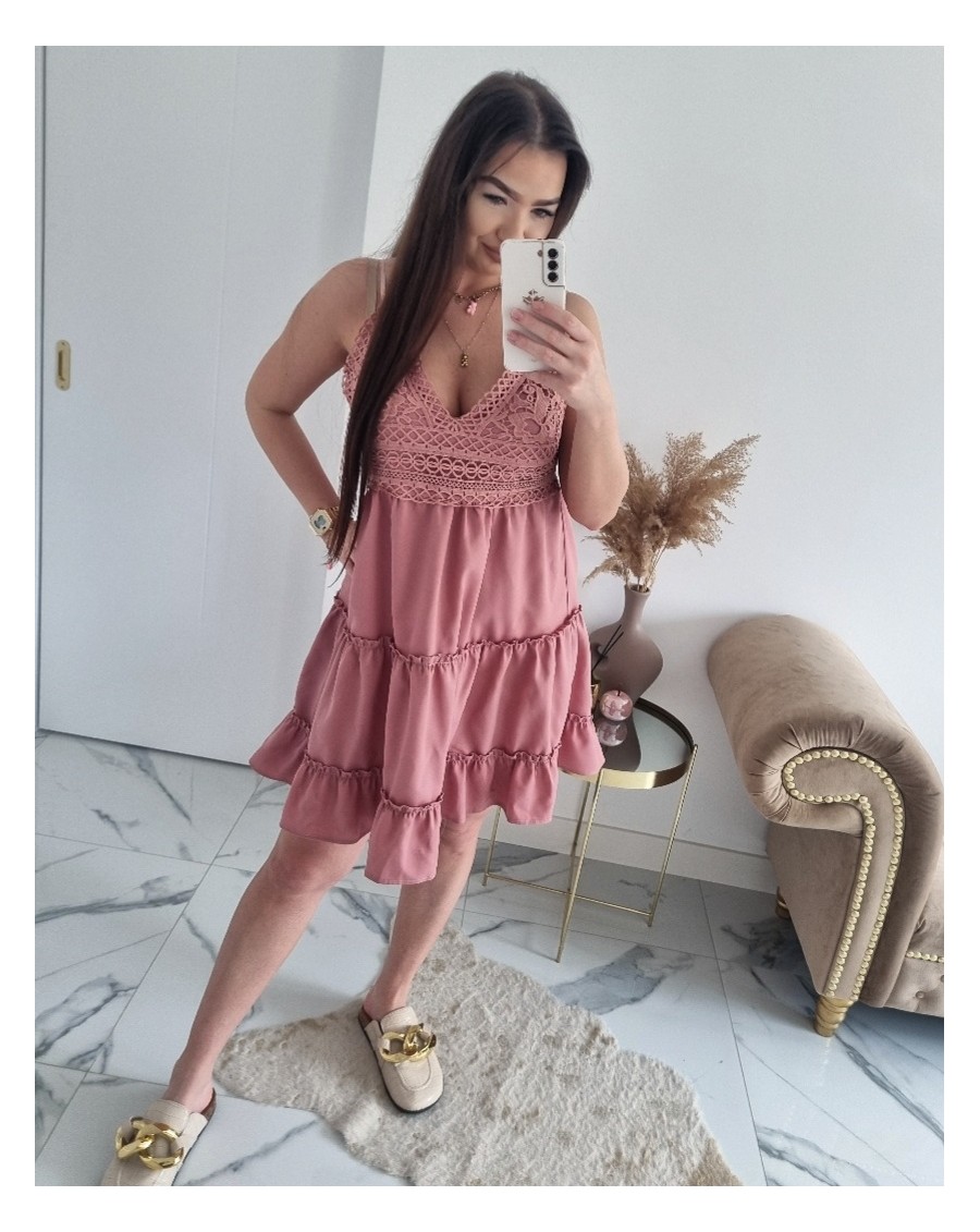 Sukienka z falbanami, wiązana z tyłu na kokardę, to bardzo dziewczęca i romantyczna propozycja dla kobiet, które cenią sobie kobiece i delikatne stroje. Sukienka posiada falbany, które dodają jej lekkości i delikatności. Dodatkowo, przy dekolcie umieszczona jest koronka. Sukienka z tyłu ma gumkę, dzięki czemu idealnie dopasowuje się do sylwetki.