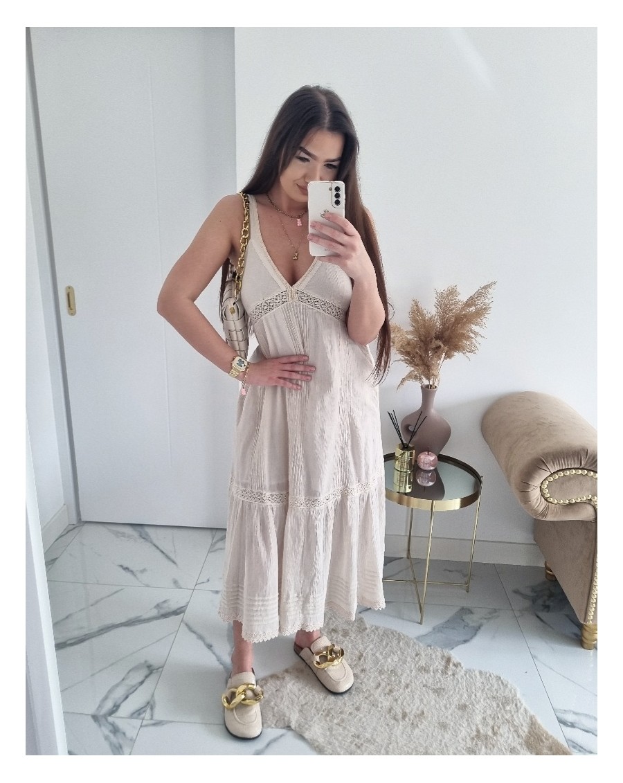 Długa sukienka na lato na ramiączka wykonana jest z lekkiej, przewiewnej bawełny, która doskonale sprawdzi się podczas ciepłych dni. Sukienka jest zdobiona beżową kornką, która dodaje subtelności. Sukienka jest luźna, co pozwala na swobodne poruszanie się.